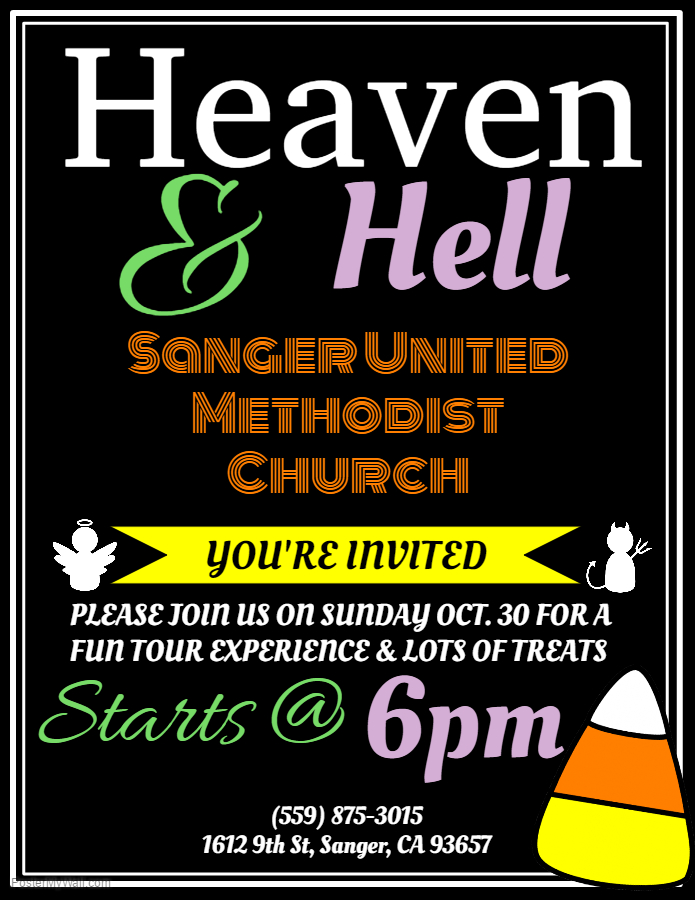 October 30, 2016 @ 6:00 pm - 8:00 pm Heaven & Hell Fun Tour Experience at SUMC Sanger United Methodist Church 1612 9th St., Sanger