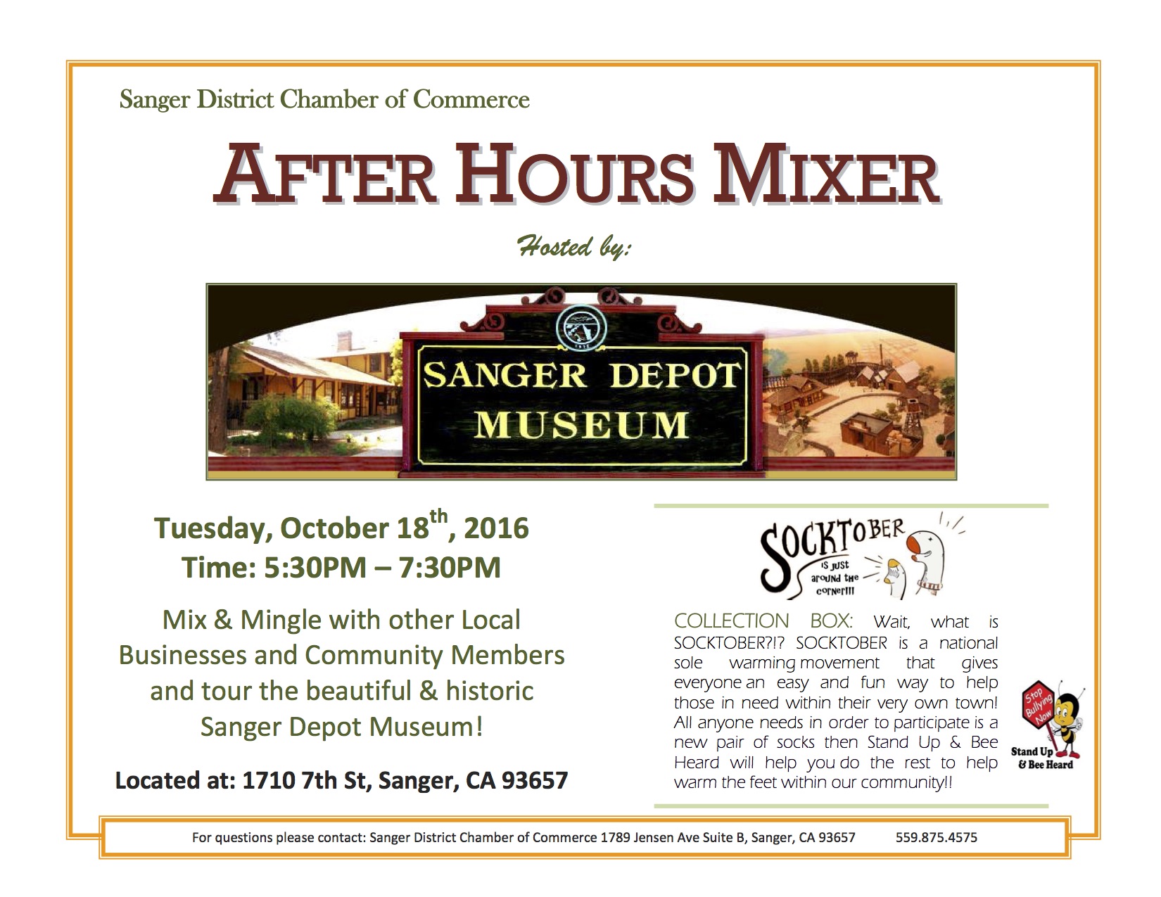 October 18, 2016 @ 5:30 pm - 7:30 pm Sanger District Chamber of Commerce After Hours Mixer- Sanger Depot Museum Sanger Depot Museum 1710 7th St., Sanger
