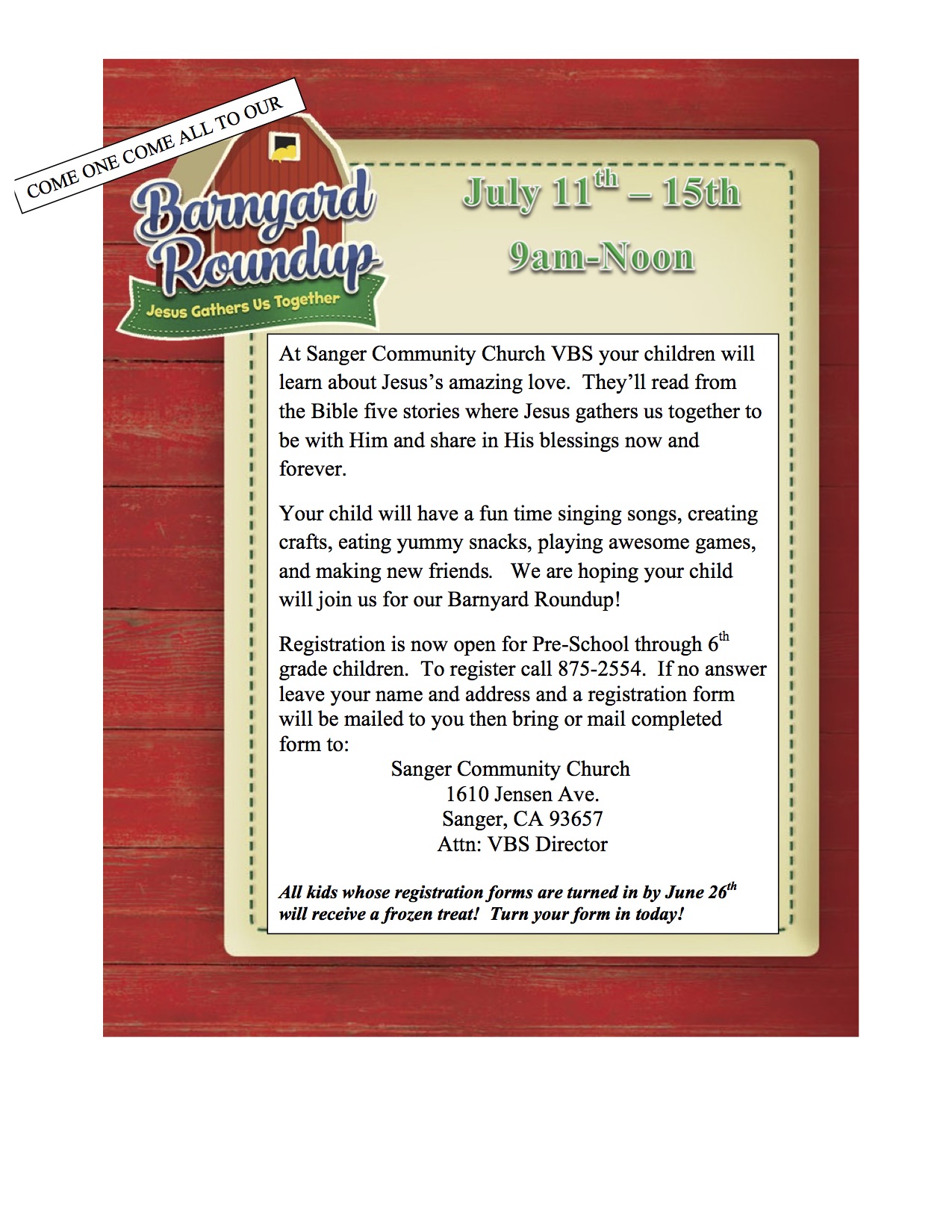July 11, 2016 @ 9:00 am - July 15, 2016 @ 12:00 pm Barnyard Roundup Sanger Community Church Vacation Bible School Sanger Community Church 1610 Jensen Ave., Sanger