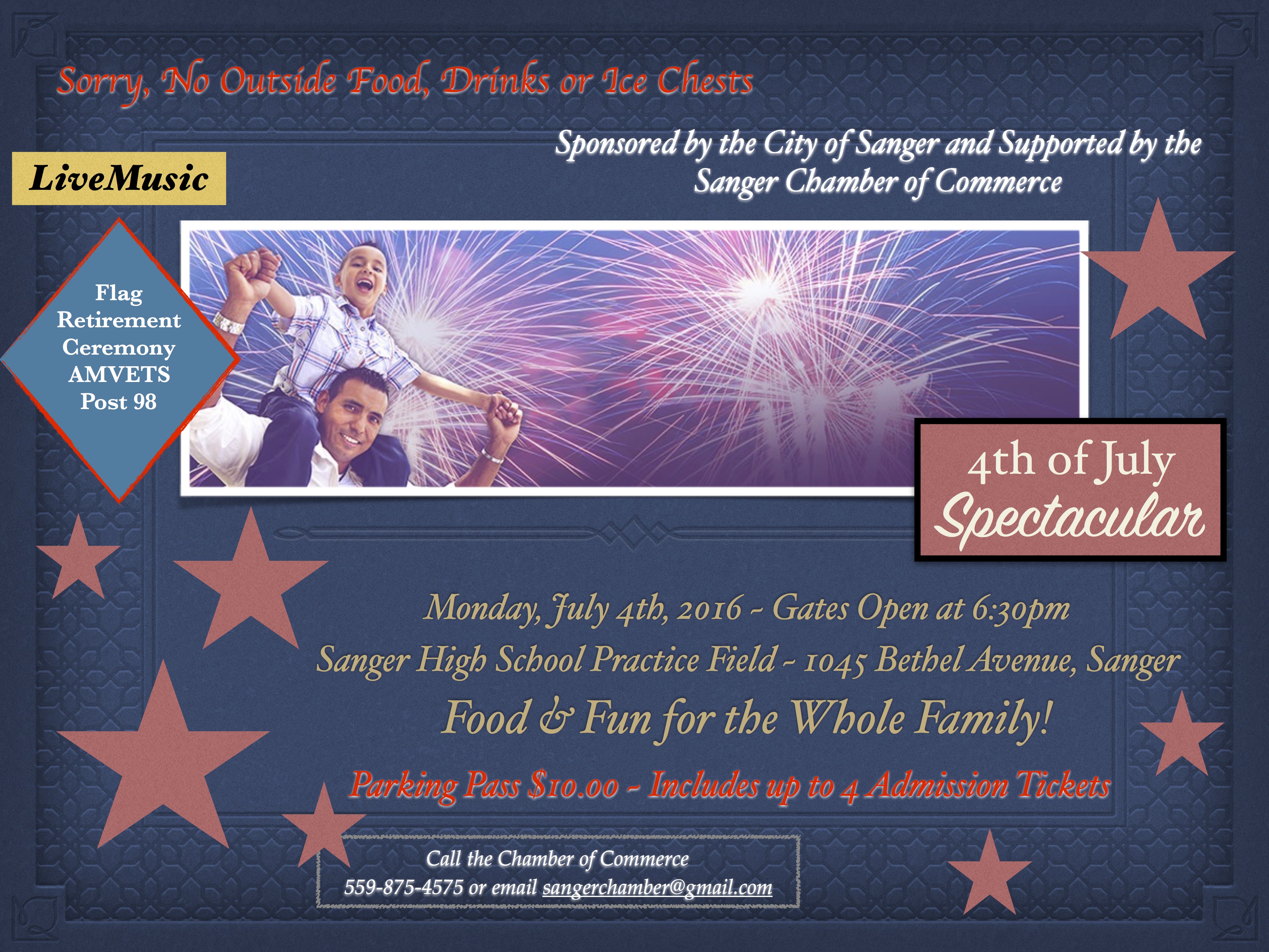 July 4, 2016 @ 6:30 pm - 10:00 pm City of Sanger 4th of July Spectacular Sanger High School Practice Field 1045 Bethel Avenue, Sanger