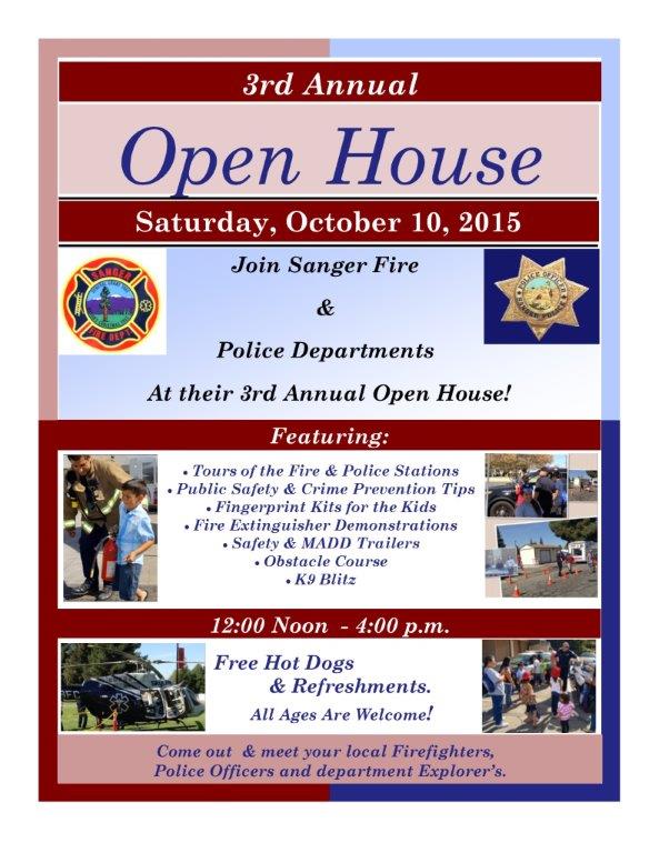 October 10, 2015 @ 12:00 pm - 4:00 pm 3rd Annual Sanger Fire and Sanger Police Departments Open House Sanger Fire & Police Departments 601 West Ave. & Jensen Ave., Sanger Free