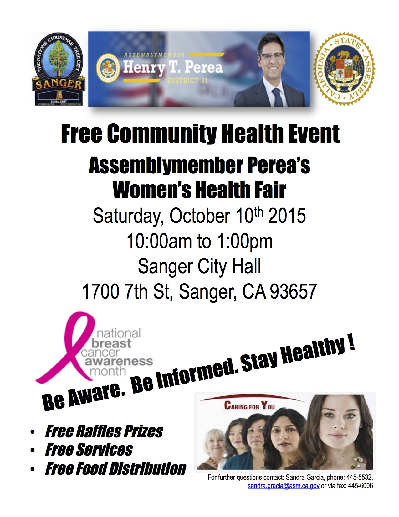 October 10, 2015 @ 10:00 am - 1:00 pm Assemblymember Perea’s Women’s Health Fair -Free Community Health Event Sanger City Hall 1700 7th St. , Sanger Free