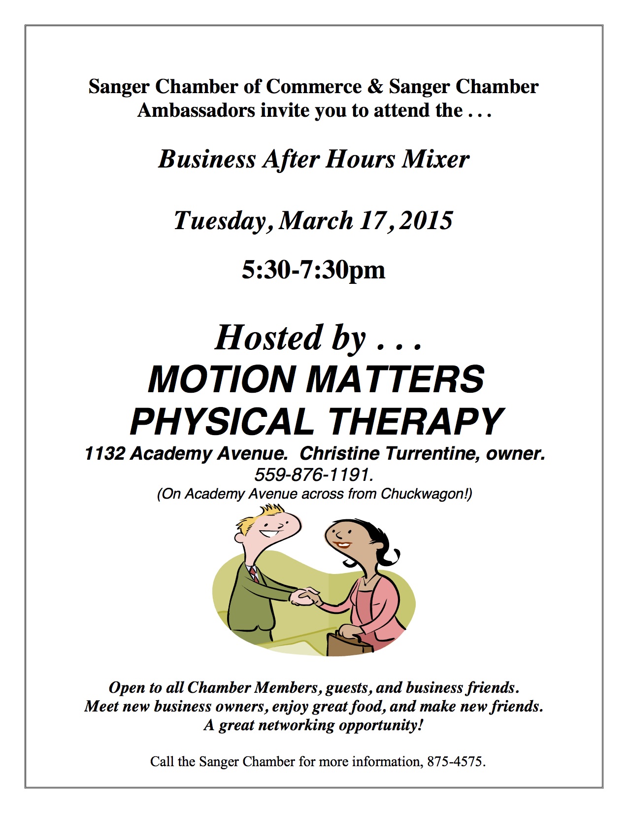March 17, 2015 @ 5:30 pm - 7:30 pm Sanger Chamber ‘Business After Hours Mixer’ @ Motion Matters Physical Therapy Motion Matters Physical Therapy, 1132 Academy Avenue, Sanger
