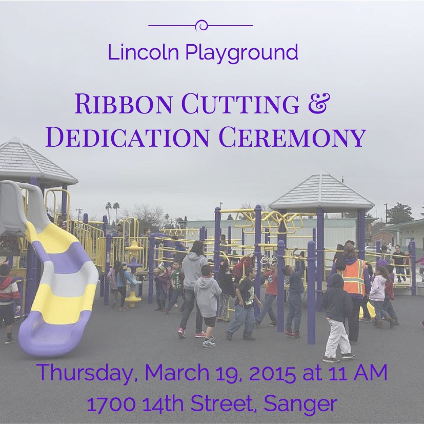 March 19, 2015 @ 11:00 am - 11:30 am Lincoln Playground Ribbon Cutting & Dedication Ceremony Lincoln School Playground 1700 Fourteenth Street, Sanger