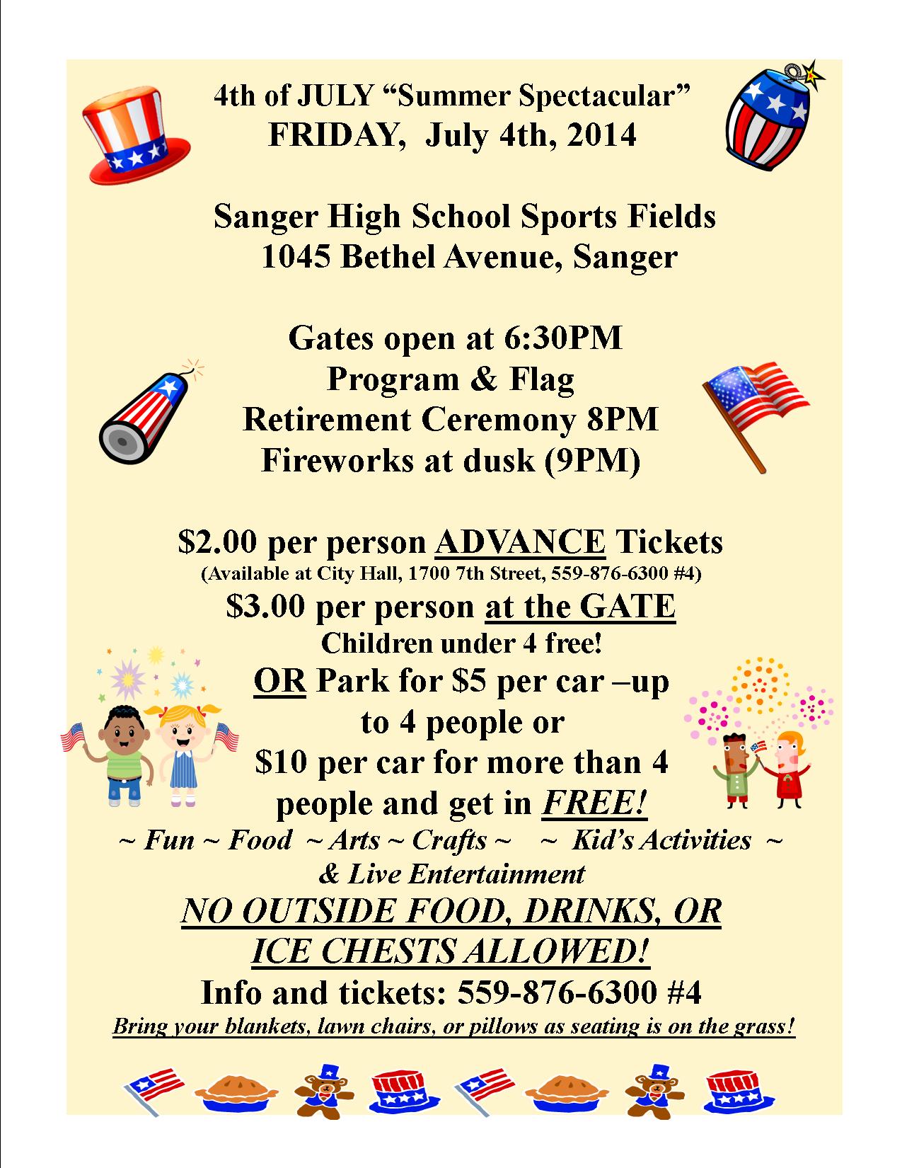 Gates Open at 6:30 p.m., Program & Flag Retirement Ceremony at 8 p.m., and Fireworks at dusk (9 p.m.). Local Band, Sugar, will be performing. For info and tickets call (559) 876-6300 #4.