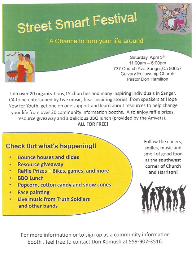 Join over 20 organizations, 15 churches, and many inspiring individuals, in Sanger, CA, to be entertained by Live music, hear inspiring stories from speaker at Hope Now for Youth, get one on one support and learn about resources to help change your life from over 20 community information booths. See posted flyer for more information.