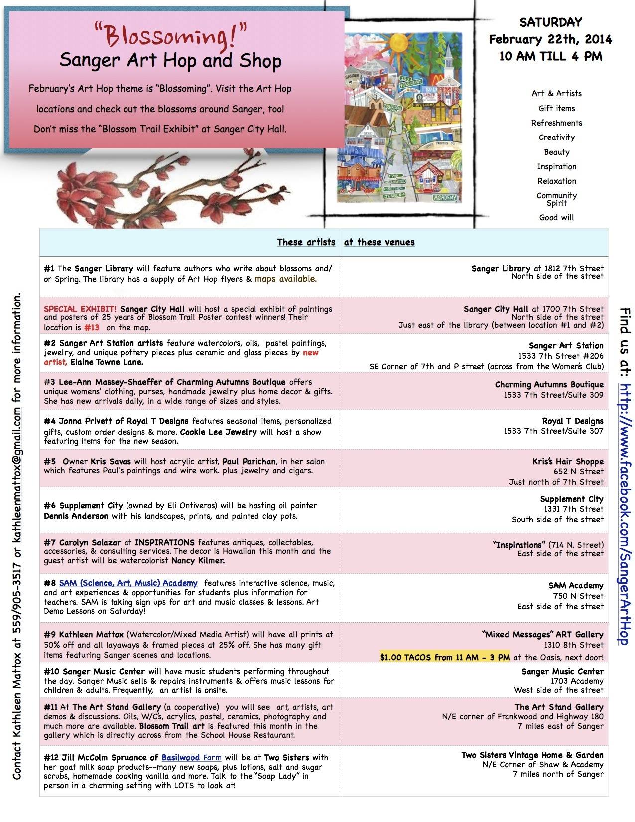Sanger City Hall 1700 7th St., Sanger, CA, United StatesThe City of Sanger, in partnership with the Sanger Art Hop Committee, will host an art display of the 1989-2014 winning selections of the Fresno County Blossom Trail Poster Contest. The display will remain in City Hall, for viewing, during regular business hours, Monday through Friday, 8AM to 5PM.