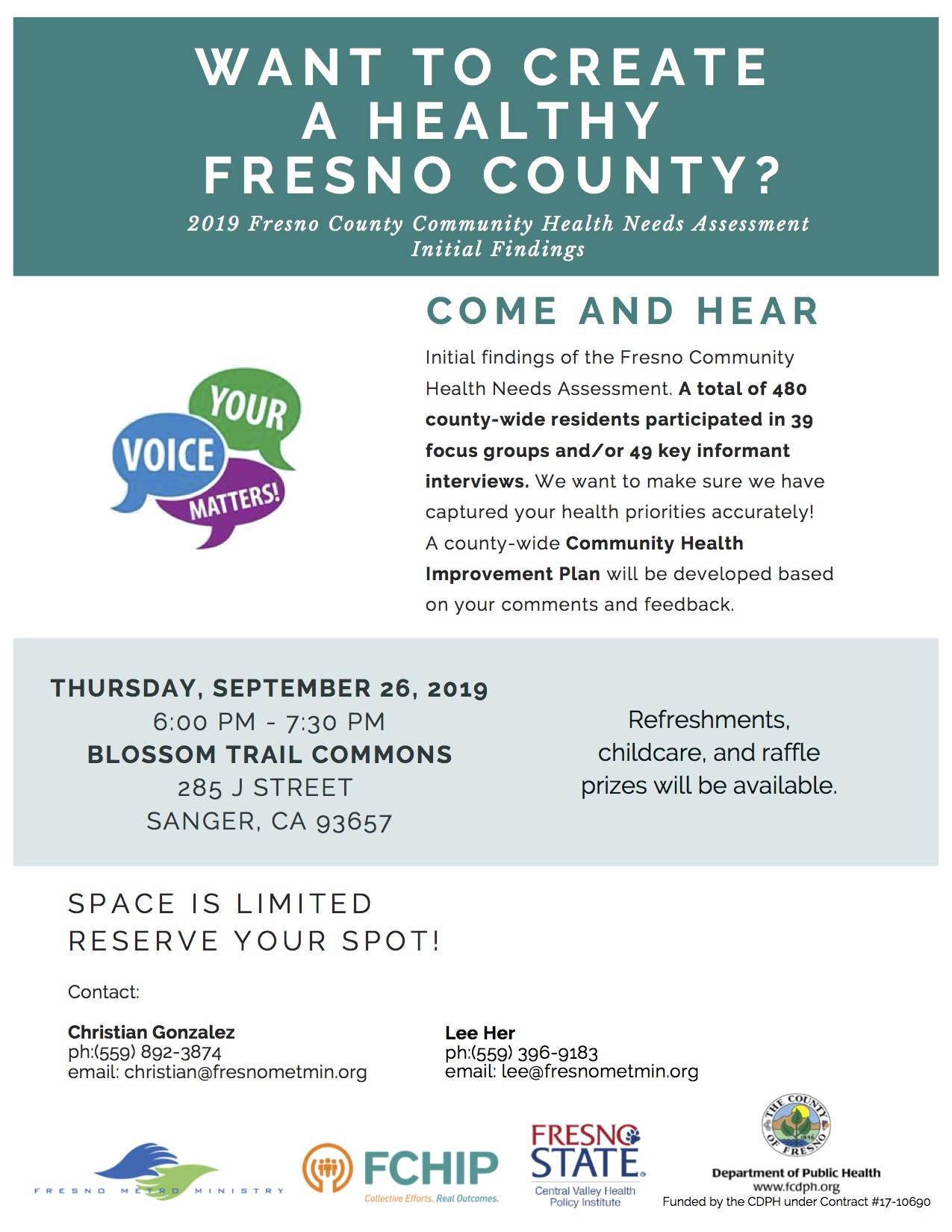 September 26, 2019 @ 6:00 pm - 7:30 pm 2019 Fresno County Community Health Needs Assessment Initial Findings Blossom Trail Commons 285 J. Street, Sanger, CA, United States