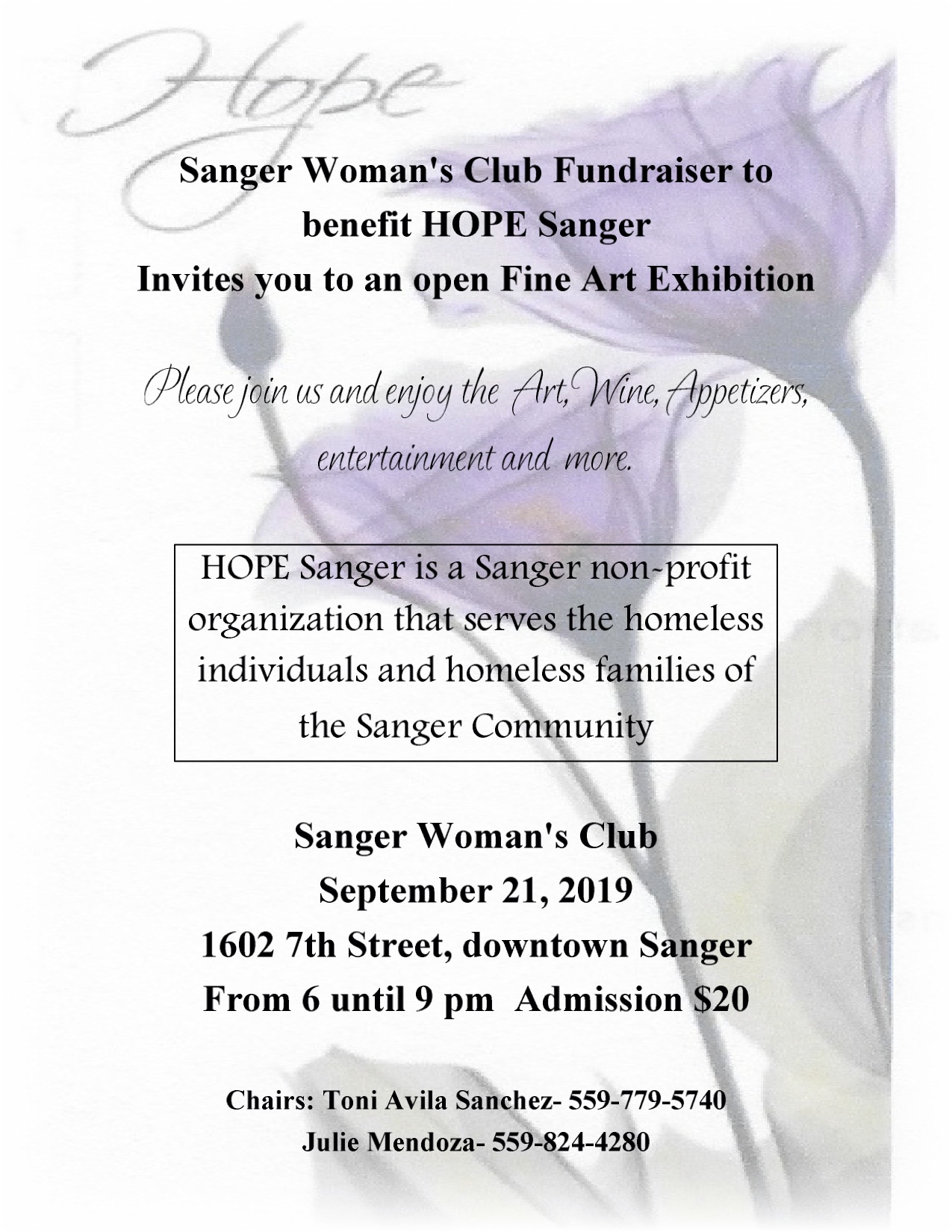 September 21, 2019 @ 6:00 pm - 9:00 pm Sanger Woman’s Club Fundraiser to benefit HOPE Sanger Sanger Woman's Club Corner of 7th & P Streets, Sanger Fine Art Exhibition $20.00