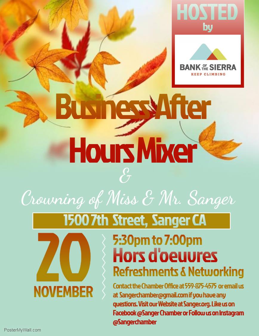 November 20, 2018 @ 5:30 pm - 7:00 pm Sanger Chamber Business After Hours Mixer & Crowning of Miss & Mr. Sanger Bank of Sierra 1500 7th Street, Sanger, CA, United States