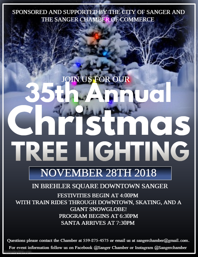 November 28, 2018 @ 6:30 pm - 8:00 pm 35th Annual Tree Lighting Brehler Square 7th & N St., Sanger , CA, United States