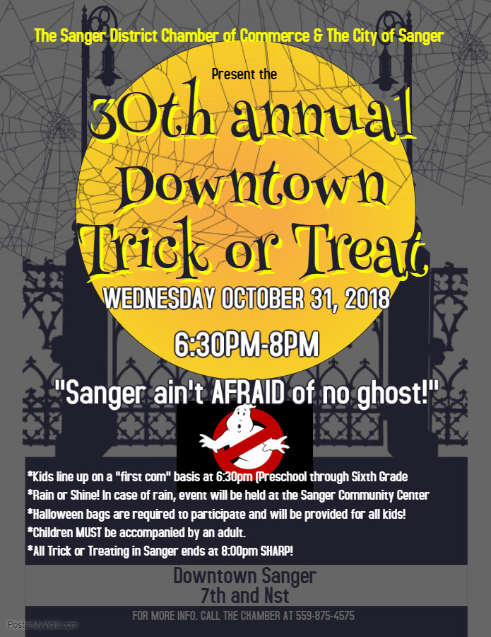 October 31, 2018 @ 6:30 pm - 8:00 pm Sanger District Chamber of Commerce 30th Annual Downtown Trick or Treat Downtown Sanger 7th & N St., Sanger, CA, United States Free