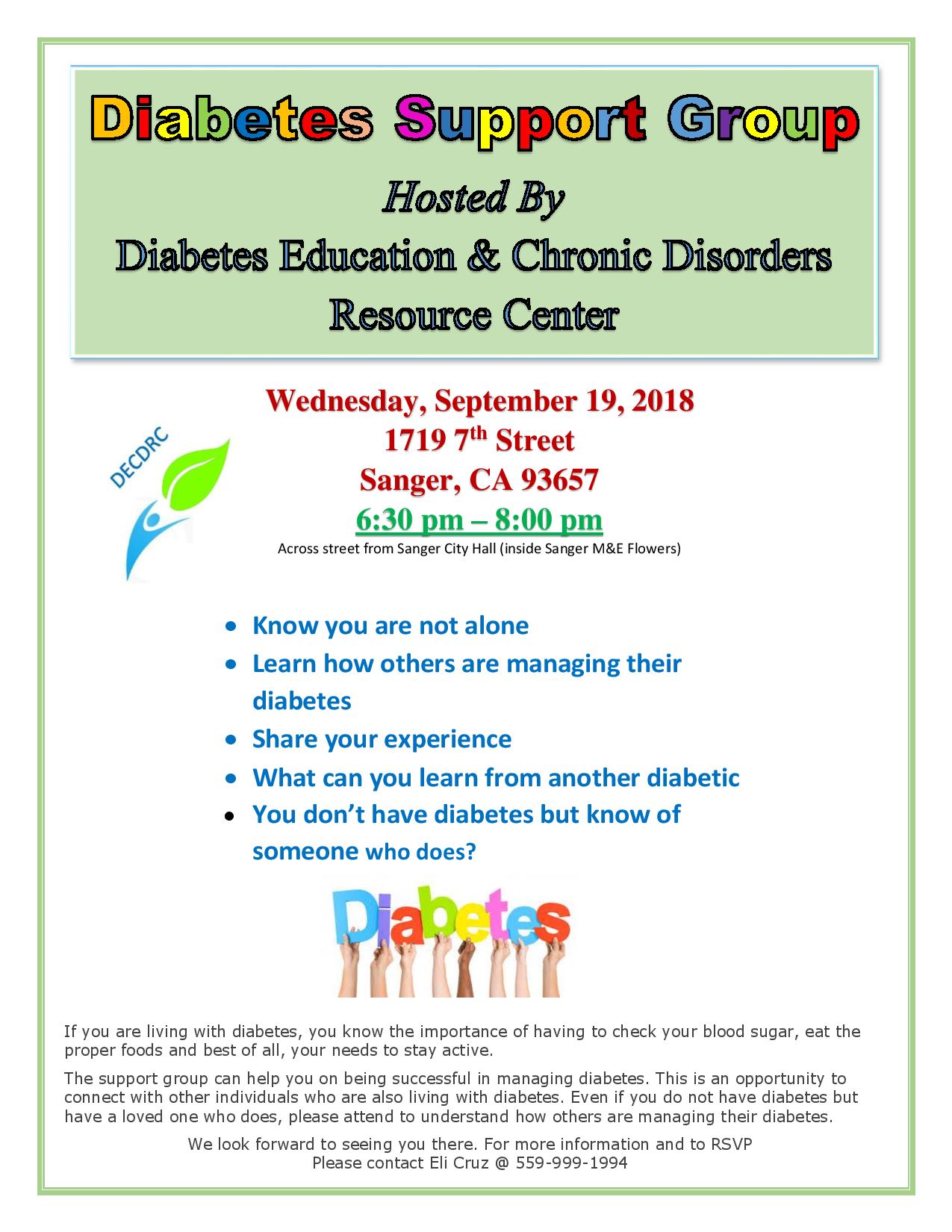 September 19, 2018 @ 6:30 pm - 8:00 pm Diabetes Support Group Sanger M & E Flowers 1719 7th Street, Sanger Free