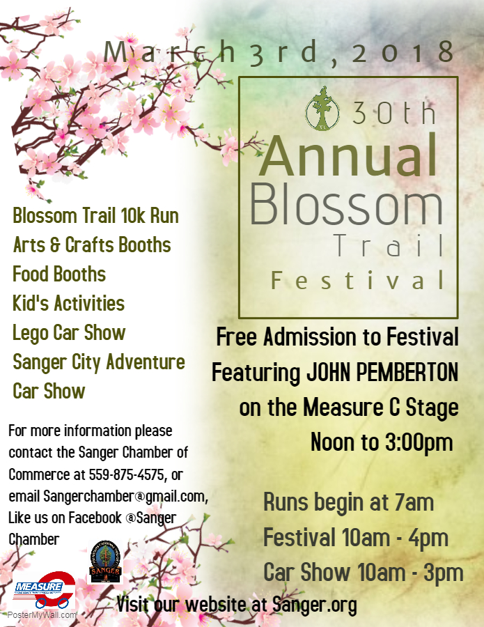 March 3, 2018 @ 10:00 am - 5:00 pm 30th Annual Blossom Trail Festival Downtonw Sanger 7th & N St., Sanger, CA, United States